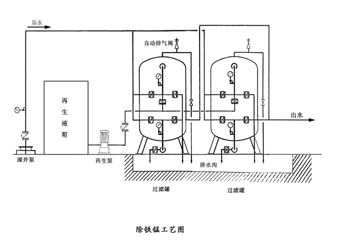除鐵錳過濾器由曝氣裝置和錳砂過濾罐組成;利用氧化法將水中低價鐵離子和低價錳離子氧化成高價鐵離子和高價錳離子,再經過吸咐過濾去除,降低水中鐵錳含量。