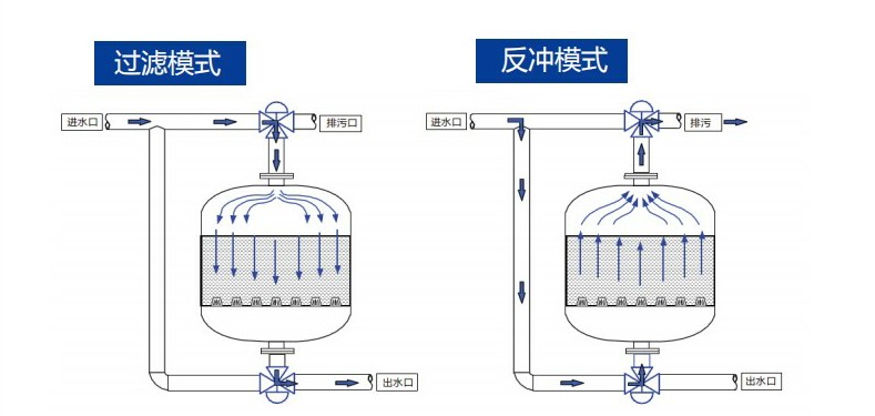 隨著雜質在填料層中不斷聚積 , 內部壓頭損失將不斷增大。當進、出水壓頭損失達到設定值或達到設定時間時 , 系統將自動激活定壓差裝置使其轉換至反洗狀態 , 當此臺反洗結束,水力閥改變給水方向從而實現逐臺反洗 , 更便于清洗聚積起來的雜質。